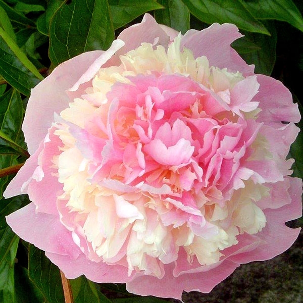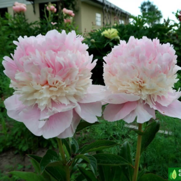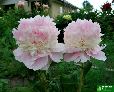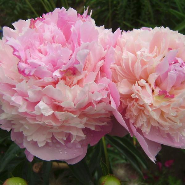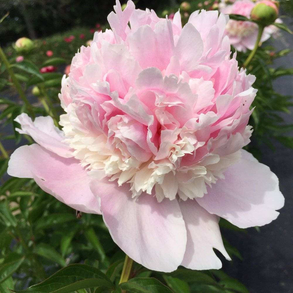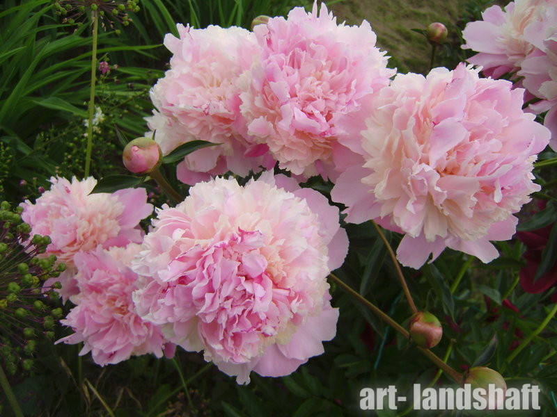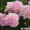 Махровый бомбовидный. Среднего срока цветения, цветок диаметром 16 см, нежно-розовый с небольшими красными мазками на скрученных центральных лепестках, аромат лёгкий, куст высотой 70 см, не разваливается, стебли прочные.