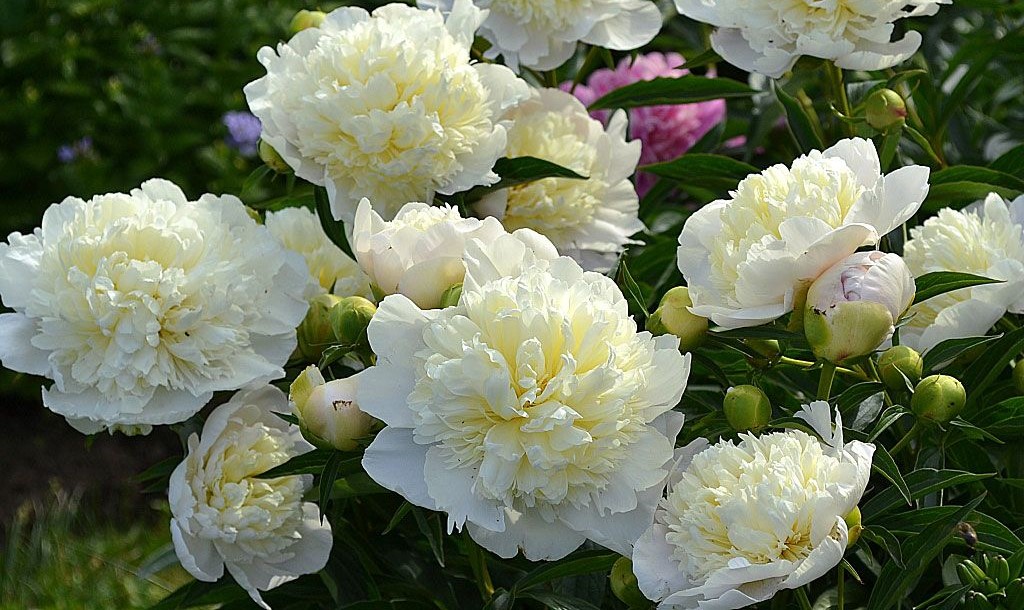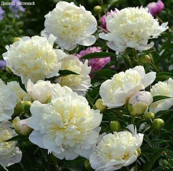 Пион образует восхитительные крупные цветы, белые с желтоватым оттенком и зеленоватым основанием лепестков, постепенно переходящие в жемчужно-белый оттенок.