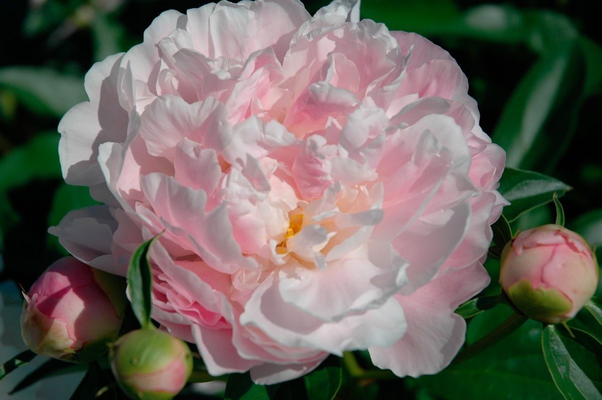 Цветок махровый, крупный. Окраска изменчивая, от нежной лососёво-розовой до тёмно-розовой, затем выцветает до белой. Тычинки жёлтые, едва заметные.