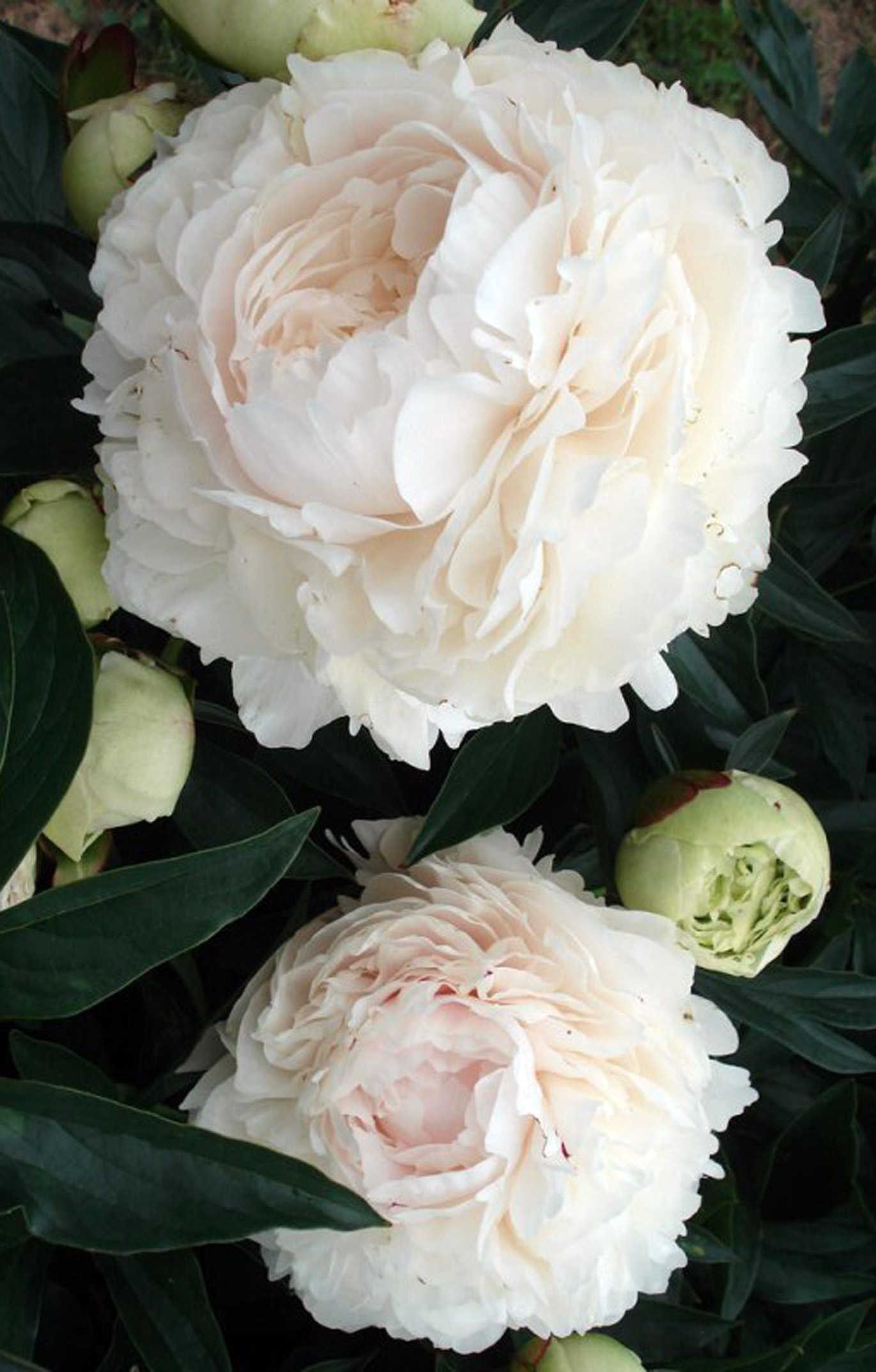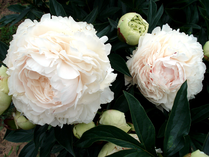 Густомахровый, очень красивой формы. Кремово-белый. Куст раскидистый густооблиственный, стебли толстые, слегка изгибаются под тяжестью цветка, применяются опоры.