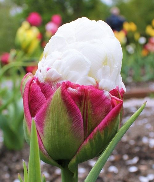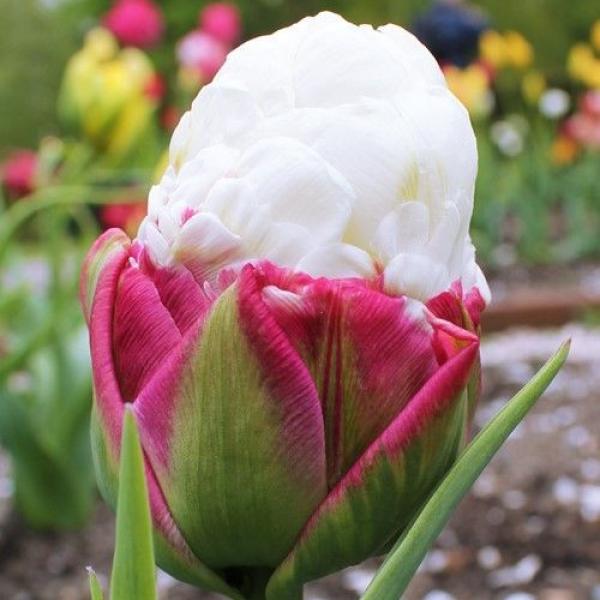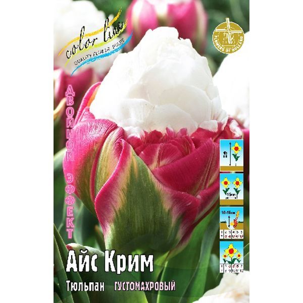Тюльпан Айс Крим относится к группе супер-тюльпанов "Двойной Эффект". Этот тюльпан сочетает в себе сразу несколько признаков: густомахровый и необычную форму бутона. Высота растения достигает 45 см. Окраска цветка: темно-розовая с зелёными внешними лепестками, в центре возвышающейся шапочкой белые лепестки. Высота бокала 8-10 см