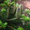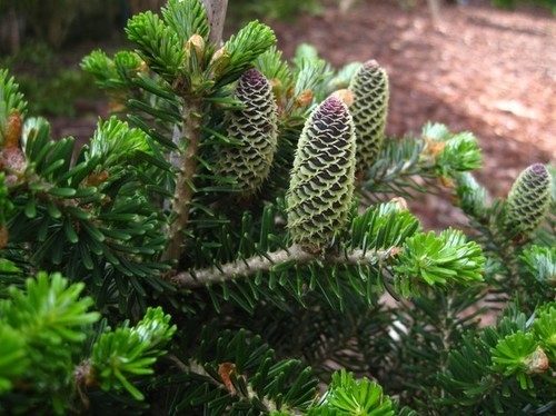 Короткая, толстая, прямая, радиально отстоящая от побега, расположена очень густо, окрашена в насыщенный зелёный цвет. Нижняя сторона хвоинок серебристо-белая. Молодые приросты на тон светлее.