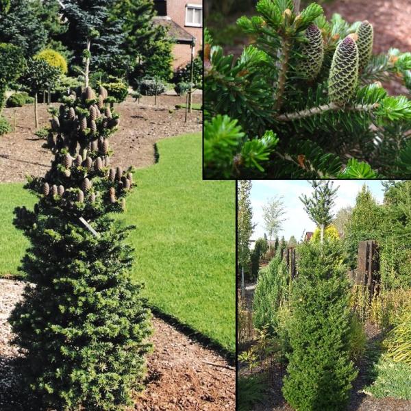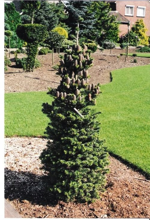 Карликовое деревце, высотой около 2,5 м; диаметр у кроны 80–90 см. Растёт медленно, годовой прирост не превышает 3-5 см. Крона формируется плотная, густая, симметричная, коническая, с чётким силуэтом. После 10 лет растение достигает 1,2 м в высоту и 0,8 м в ширину.