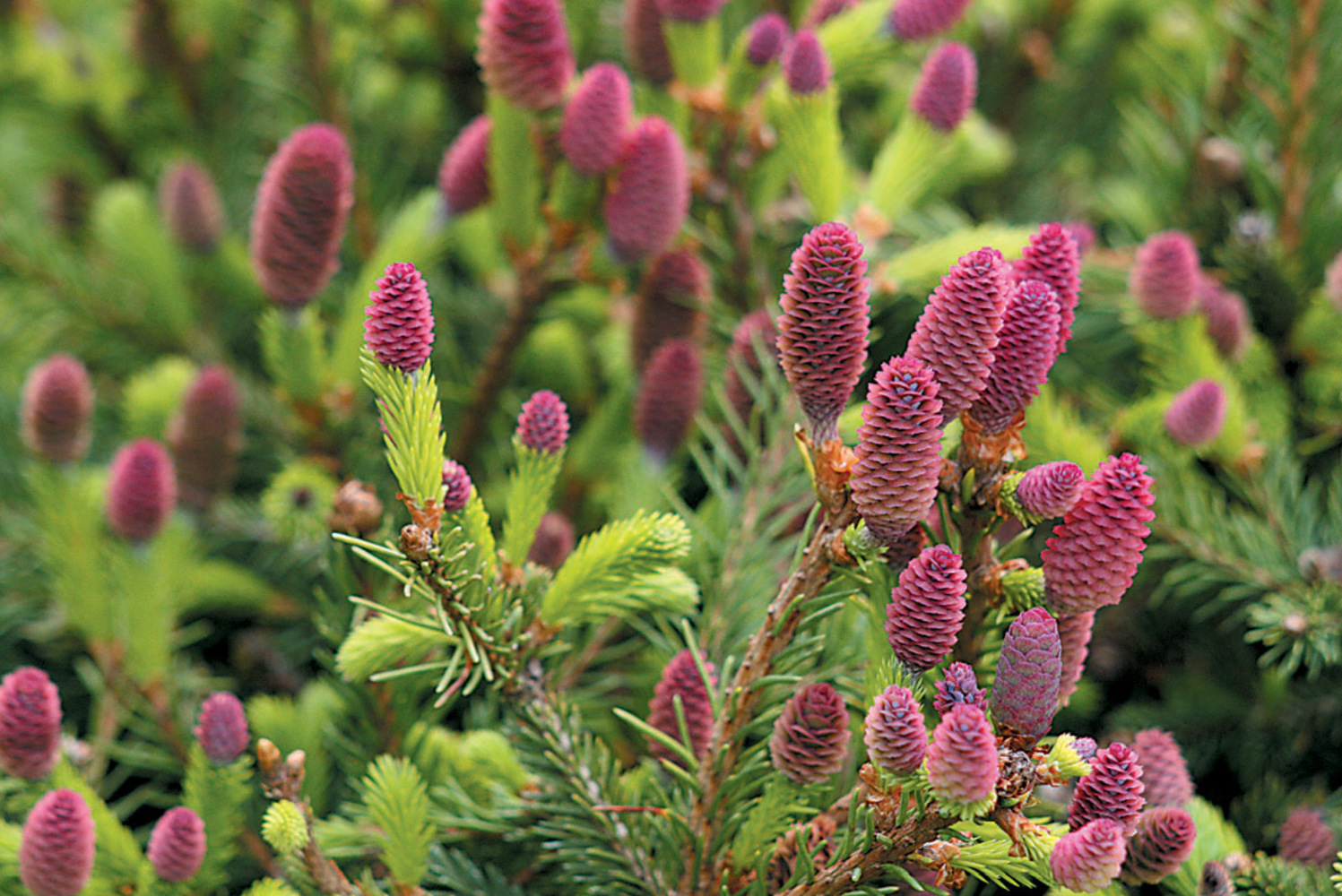 конусовидная форма ели. Высота 3-4 м, диаметр кроны 2 м. Очень декоративна в весенний период за счет розовых шишек и молодых приростов ярко-зеленого или нежно-салатового цвета на фоне темной хвои.
