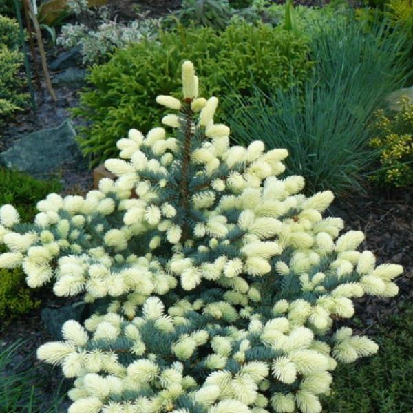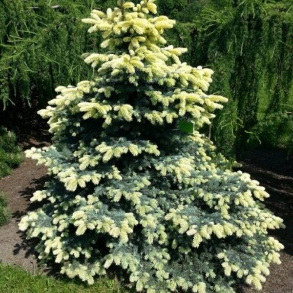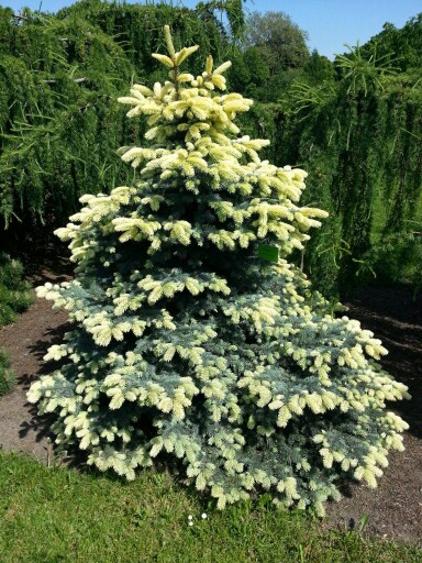 Небольшое хвойное дерево 2-3 м высотой, ширина 1 м. Крона неправильной формы, достаточно плотная. Хвоя серебристо-голубая, весной на молодых приростах бледно-желтая или соломенного цвета.