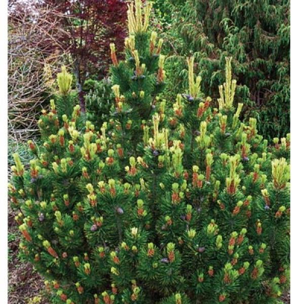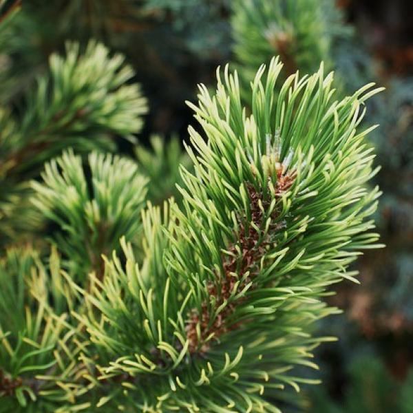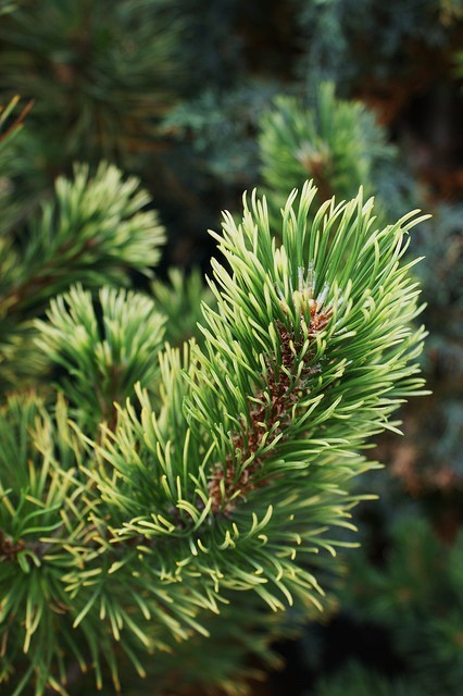Хвоя длиной 3-5 см, по 2 в пучках, очень колючая, летом - тёмно-зелёная. Молодой прирост кремово-белого цвета.