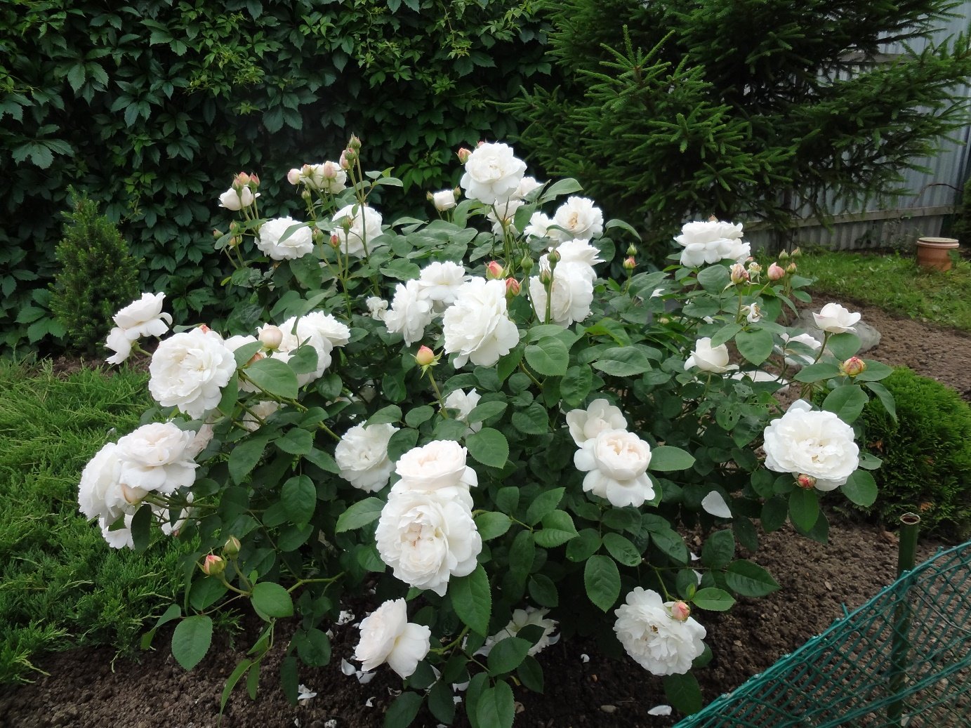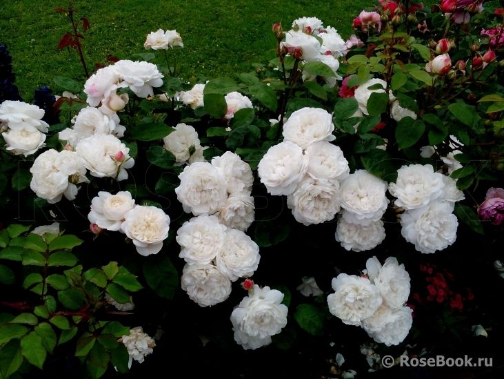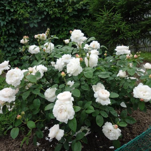 Куст хорошо ветвится, одет густой, матовой чисто-зеленой листвой, не подверженной грибковым заболеваниям. Длинные цветочные побеги разветвляются на верхушке и образуют красноваты бутоны, из которых появляются чисто-белые цветки около 9 см в диаметре.