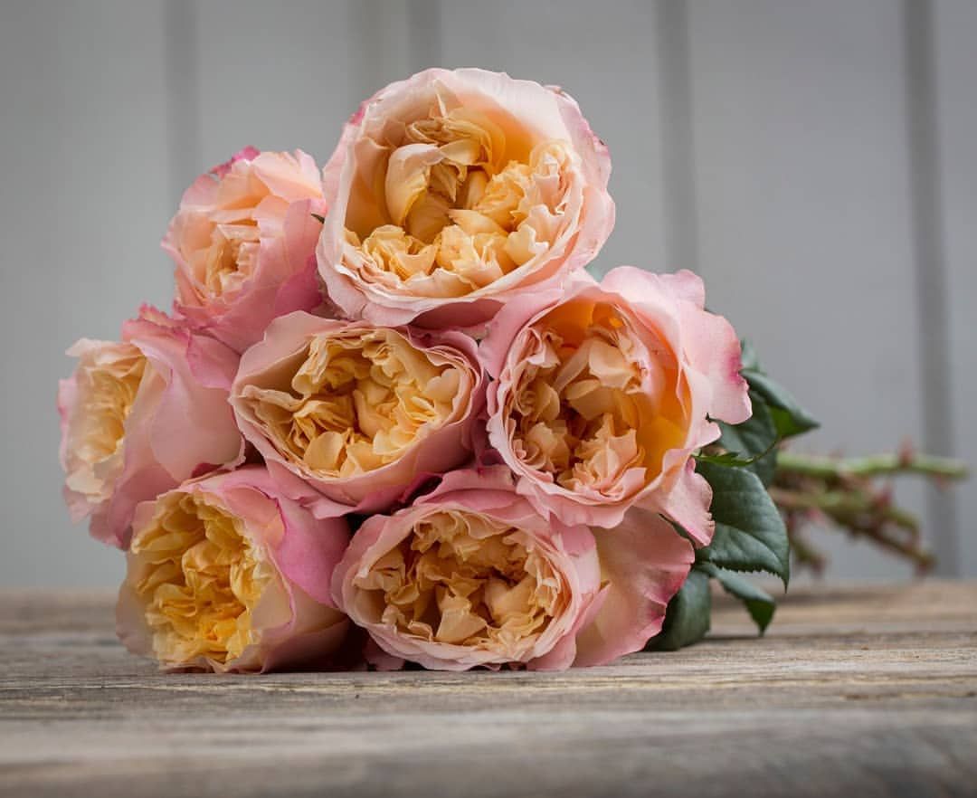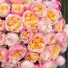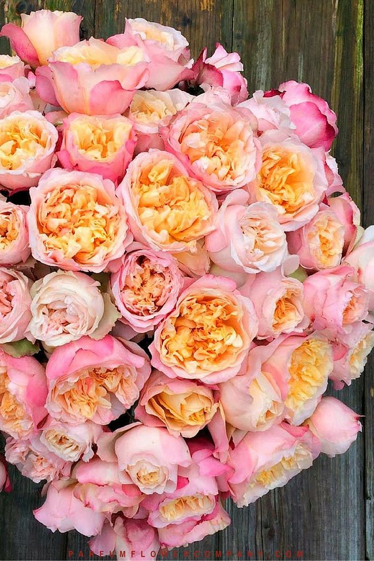 Центр каждого цветка имеет цвет старого золота с персиковыми тонами и чётко отделён наружными розовыми лепестками, что создаёт впечатляющий эффект.