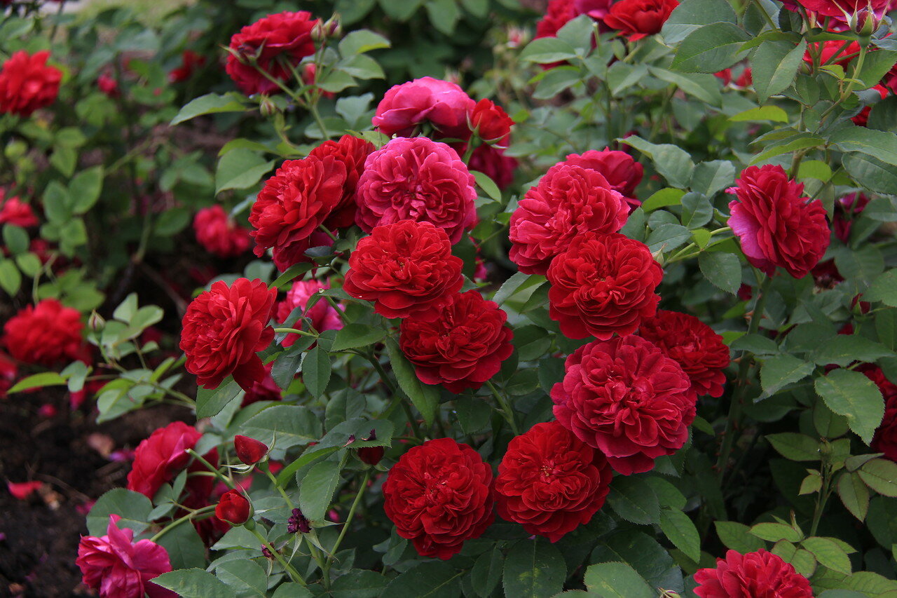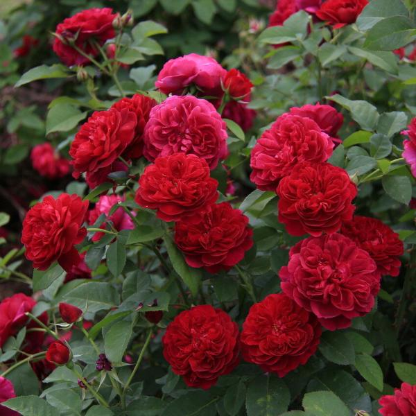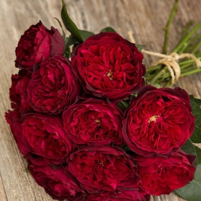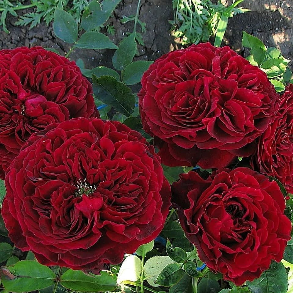 Тёмно-красные, густомахровые, блюдцевидные цветки из 120 лепестков с лёгким ароматом чая в соцветиях из 1-4 цветков. Нижняя сторона лепестков имеет красно-фиолетовый оттенок.
