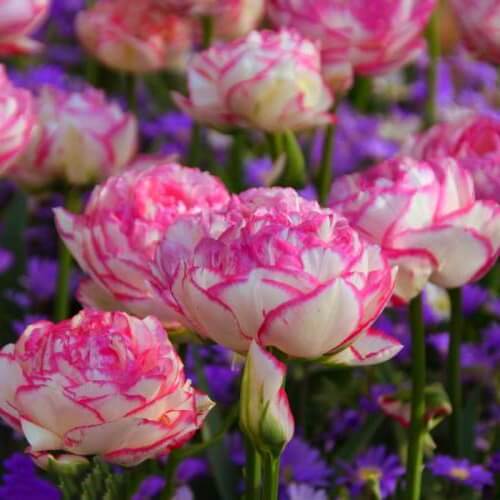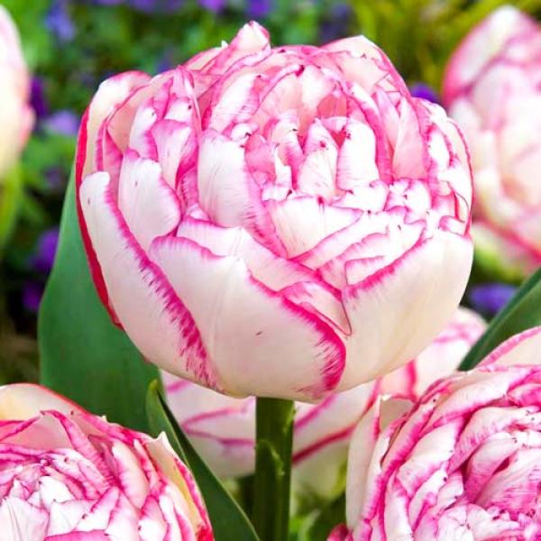 Тюльпан Дабл Тач 5 шт относится к махровым поздним сортам. Цветет в мае, образуя пышный крупный бело-кремовый бутон с темно-розовой каймой по краям лепестков, высотой до 6-8 см. В раскрытом виде цветок достигает в диаметре до 9 см. Продолжительность цветения - до 2-3 недель. Красивый и нежный цветок тюльпана возвышается на крепком стебле, высотой 40 см.