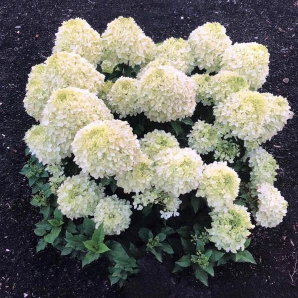 Очень красивый сорт для любителей белых гортензий, она расцветает лаймовыми оттенками,