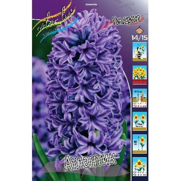 Гиацинт "Атлантик" - крупноцветковый сорт с ярким и интенсивным цветением. Плотные соцветия, состоят из множества звездчатых лилово-синих цветков, края лепестков имеют более светлый оттенок. Цветки с сильным ароматом.