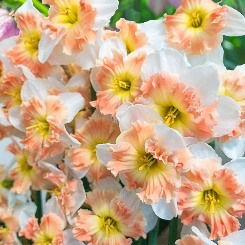 Белый, коронка с сильно-гофрированным краем цвета фламинго, один из лучших сортов крупнокорончатых/сплиткорончатых нарциссов.